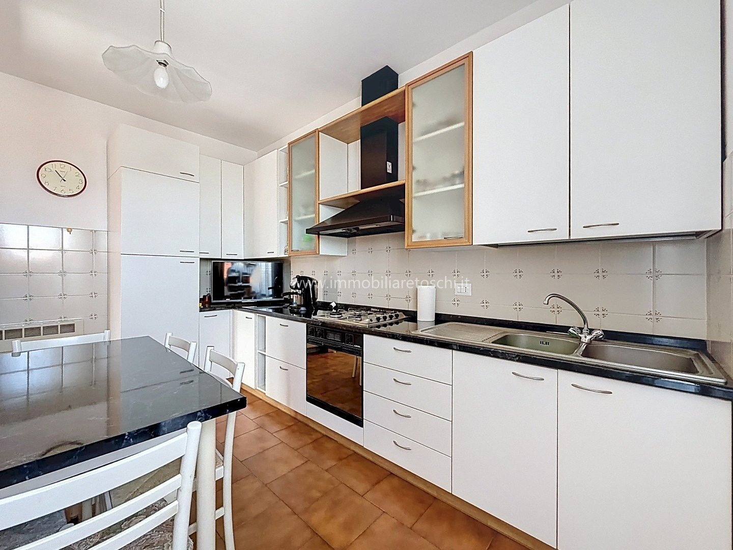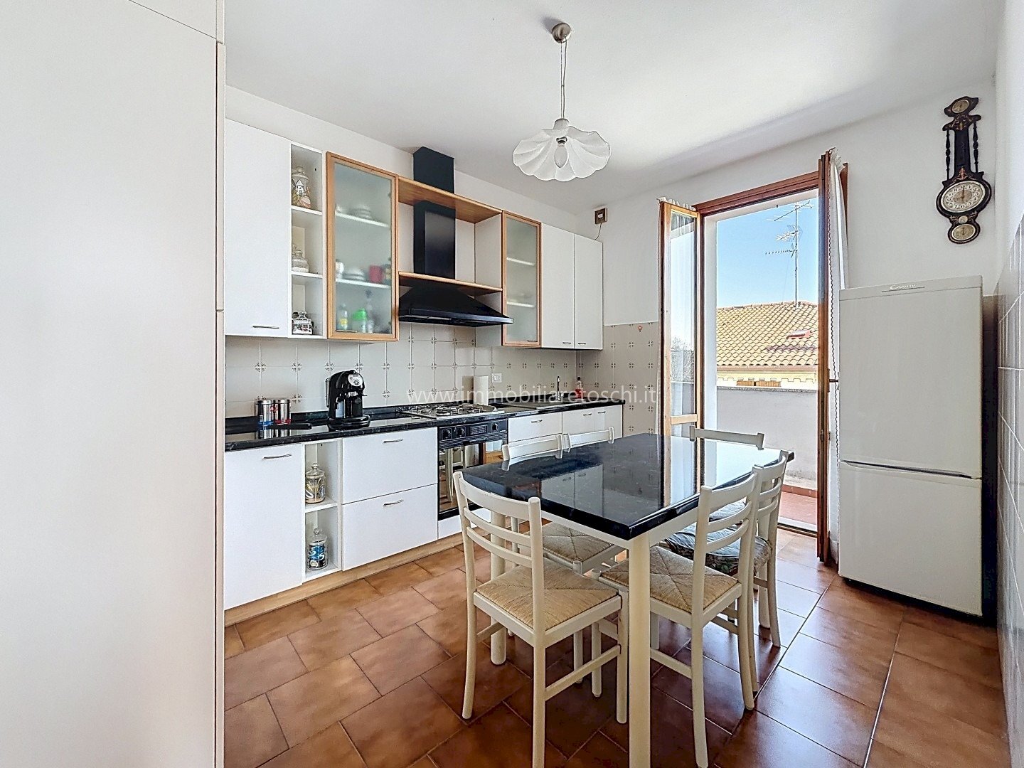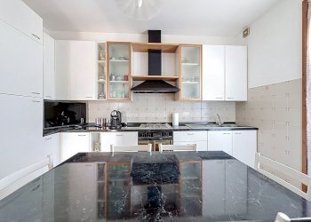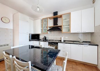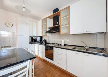 L’ingresso si apre su un luminoso soggiorno doppio con accesso alla terrazza; grazie alle sue dimensioni, questo ambiente consente di ricavare comodamente uno studio. La cucina è abitabile e servita da balcone.