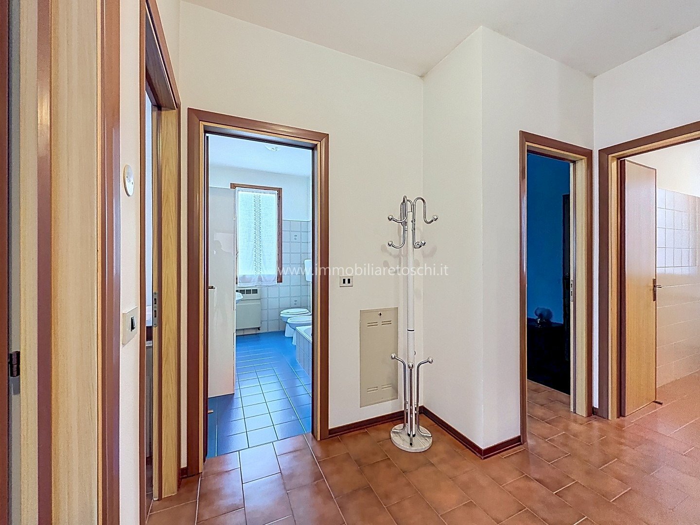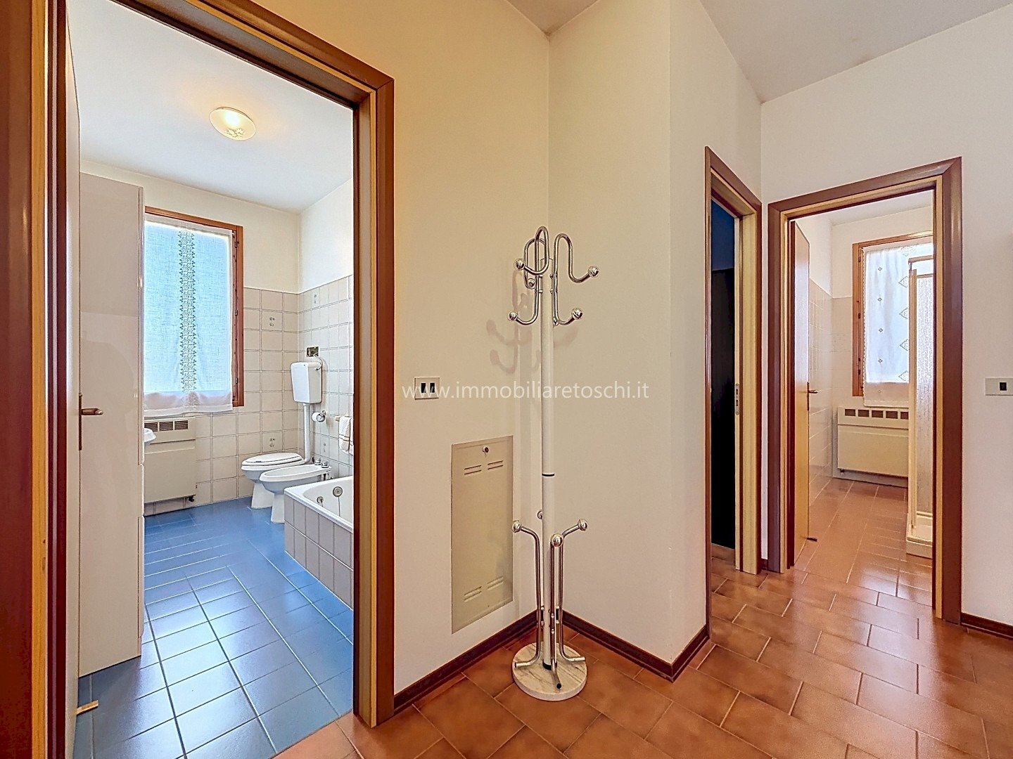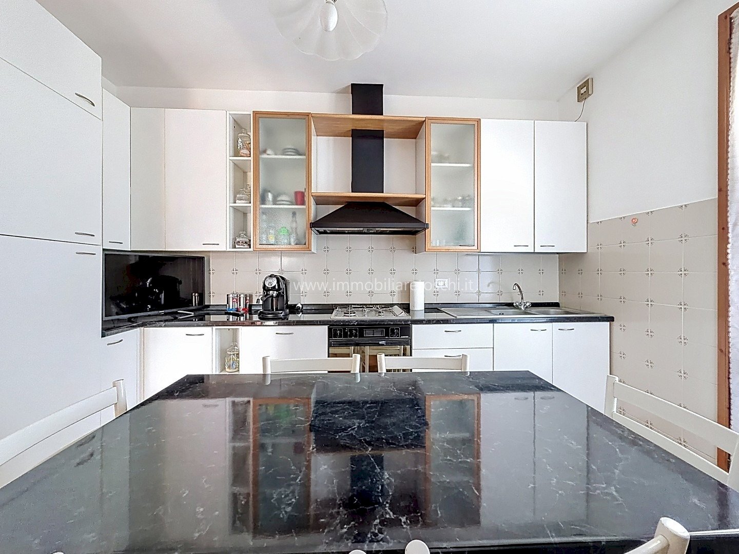L’ingresso si apre su un luminoso soggiorno doppio con accesso alla terrazza; grazie alle sue dimensioni, questo ambiente consente di ricavare comodamente uno studio. La cucina è abitabile e servita da balcone.